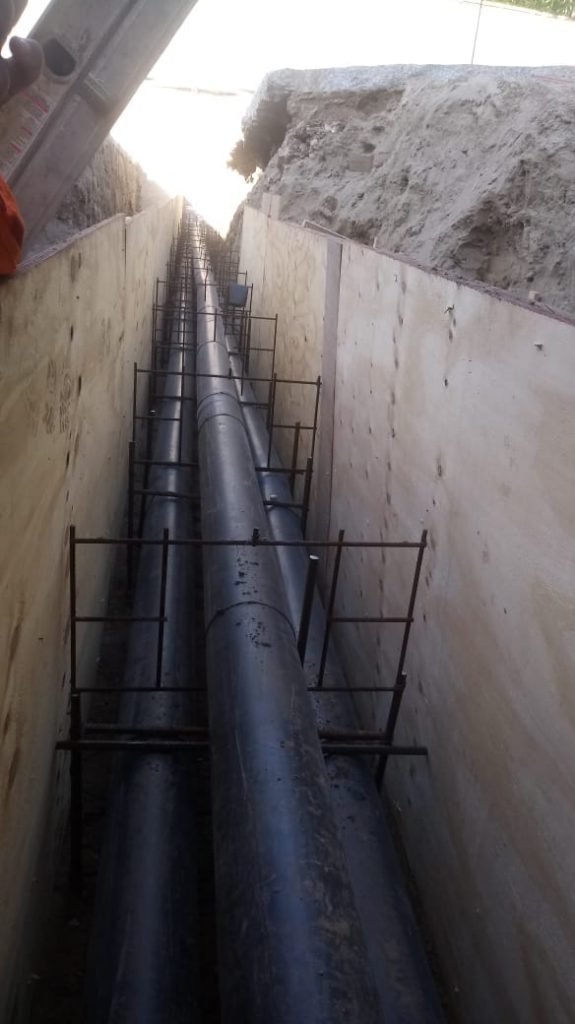 Ejecución de la obra civil para el del tendido de servicios troncales de la traza de la autopista consistente en la ejecución de 360m de longitud con un paquete de 15 caños de PVC ø110 para fuerza motriz, 6 planchas de cuatritubos para corrientes débiles, 2 caños de PVC ø110 para semaforización y la construcción de las cámaras intermedias indicadas.